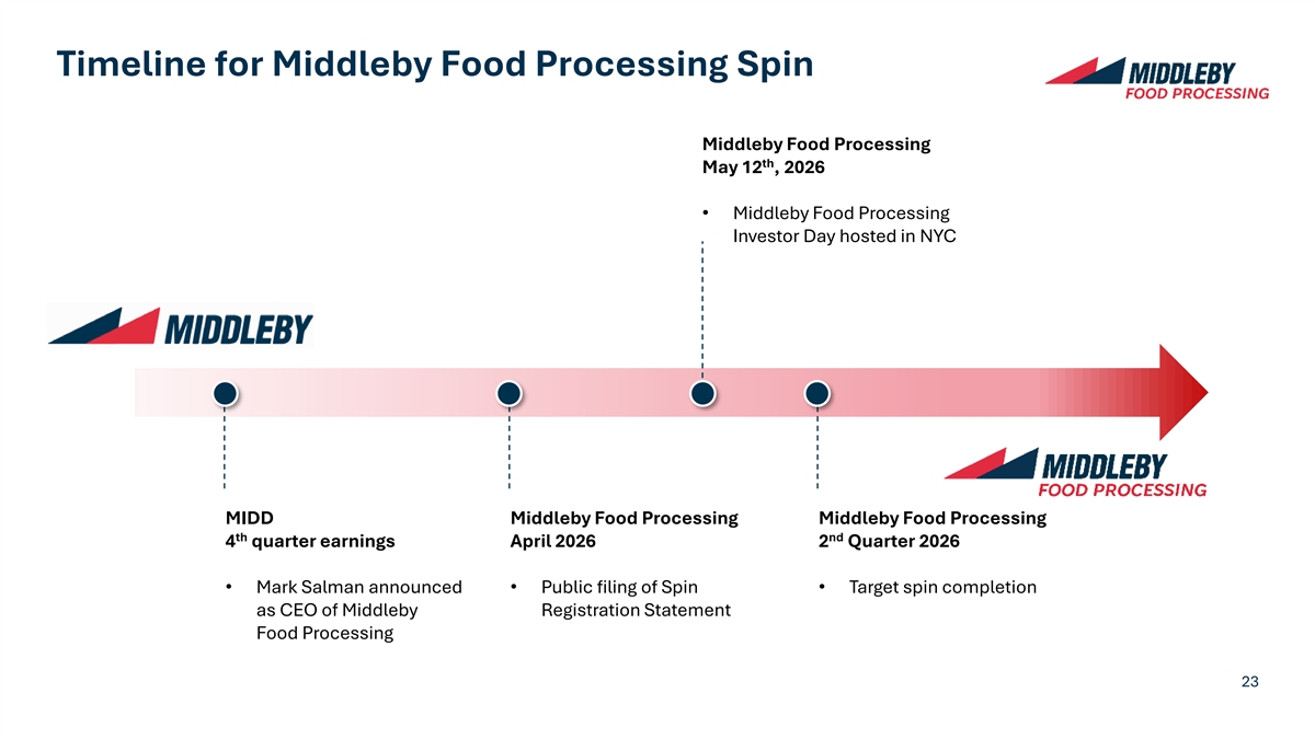 Middleby Food Processing Financial Outlook Q1 2026 & FY 2026 Guidance (in $m) Stand-Alone Corporate Costs % Growth % Growth Preliminary estimate of vs Mid- vs Mid- standalone and run- Q1 ’26 Q1 ’25 Point FY ’26 FY ’25 Point rate public company costs of $27-32m +22% +7% Revenue +10-15% +4-6% Excludes stock-based $200-210m $168m $895-925m $850m Organic Organic compensation growth growth Estimates to be further refined and detailed in the Form 10 Adj. $37-41m $30m +30% $186-208m $172m +15% EBITDA 22