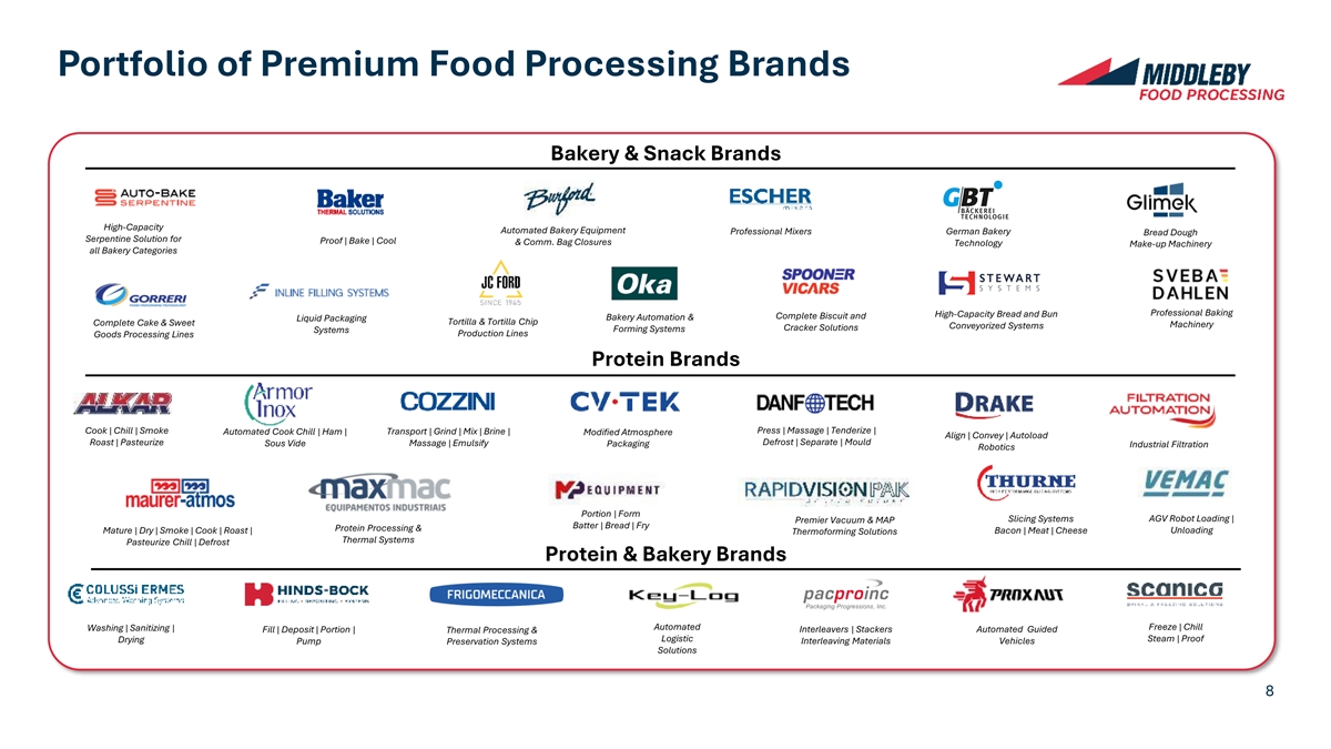 Middleby Food Processing Strong Foundations By the Numbers Diverse & Large End-Markets Bakery & Snack Protein 1 $850m $172m¹ 20% • Alternative• Artisan / flatbread • Bacon• Biscuits / crackers Revenue Adj. EBITDA Adj. EBITDA Margin Category • Case ready• Bread • Buns • Charcuterie Leader • Deli / lunch meat• Cakes / muffins Growing Solutions in • Egg bites• Energy bars Targeted Food 33 30+ Years Categories • Poultry• Pizza / pastries Industry Leading Median Tenure of Top • Philly steak• Tortilla / snacks Brands 10 Customers • Sausage / Hot dog Denotes leading position in category Equipment vs. Aftermarket Market Category Geography FY’25 Revenues 4% 10% 9% 40% 52% 31% 56% 38% 60% US / Canada EMEA Latin America APAC Protein Bakery Snack 7 Equipment & Installation Aftermarket Parts & Service 1 As reported in 2025A earnings release and excludes any allocation of corporate costs
